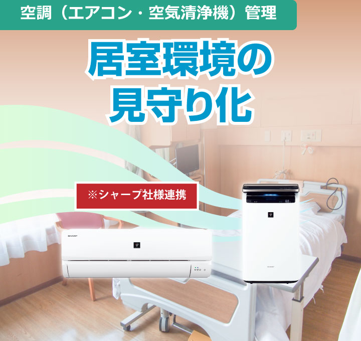 そこで最適なのが、シャープ製のエアコンや空気清浄機と連携したYuiコールシステムです。館内中の空調機器の稼働状況をYuiステーション画面で一括で確認し、遠隔動作で空調機器の調節が可能。定期的な居室巡回の軽減に役立ちます。